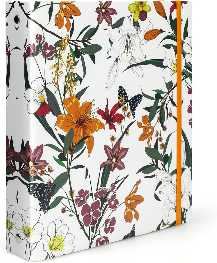 This binder is so cute and I love that it has an elastic cord to keep it closed. This will hold 175 sheets of paper. The matt finish is scratch resistant. This does not have any dividers in it, but the price is right and you can always purchase some or make your own.
