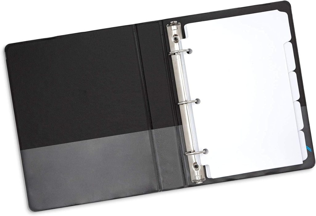 I made my own planner a couple of years ago. The problem was it was too big, 8.5×11 inches. I came across a 5.5×8.5 binder when I was cleaning out my desk. I’ve found this size works better for me because it isn’t so big, which is important since it goes everywhere with me. Fortunately, this binder already had alphabetical tabs, so all I had to do was flip them over to the non-printed side. I found a ton of this-sized binder on Amazon, some very basic, and others with cute covers and some bells and whistles.