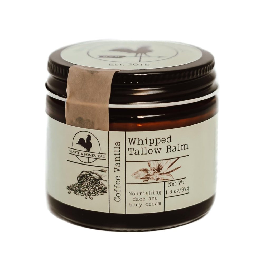 Yes, this is made from tallow. So if you are a vegan, pass on this one. Tallow is rich in vitamins A,D,E,K and B1 as well as stearic and oleic fatty acids and saturated fat. This yields a balm that is nourishing to your skin, but also highly shelf stable! Hearth and Homestead is a small business out of Virginia. They source the tallow from local farms. This is wonderful to soothe dry hands and you only need a small amount. There are different scents available. Go check out this product and support a small business.